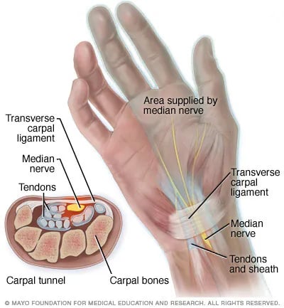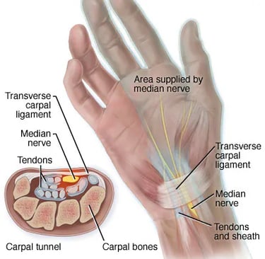 The carpal tunnel is a tight, rigid space made of bones and ligaments. When swelling, inflammation, or repetitive strain narrows this tunnel, the median nerve becomes compressed.